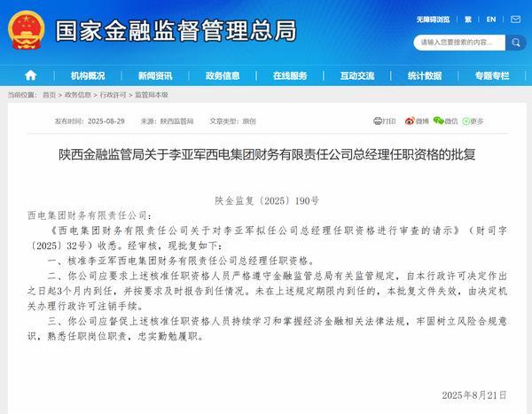 同时,陕西金融监管局核准李亚军西电集团财务有限责任公司(现“中电装财务有限公司”)总经理任职资格。以下是相关批复正文: