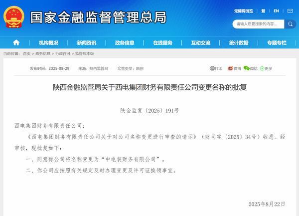 中国网财经8月29日讯今日,陕西金融监管局公布相关批复,同意西电集团财务有限责任公司将名称变更为“中电装财务有限公司”。以下是相关批复正文: